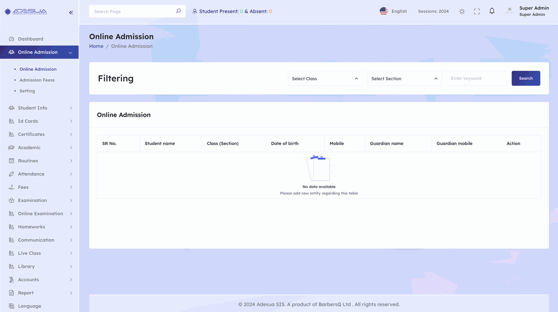 A complete end-to-end solution to make managing your school or college an enjoyable experience. Adesua is a powerful and feature-rich school management system offering a wide range of features including online admission, student information management, academic, fees, examination, transaction, attendance, report, staff manage, subscription, school gallery, library and many more.